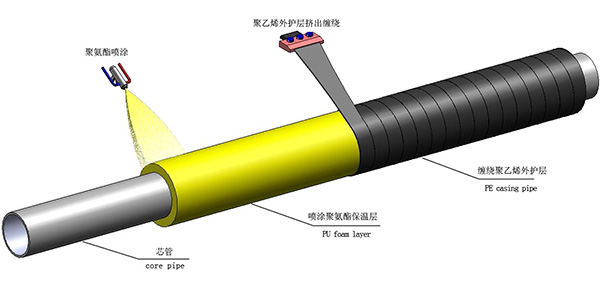 硬質聚氨酯噴涂聚乙烯纏繞預制直埋保溫管由輸送介質的工作鋼管(芯管)、聚氨酯硬質泡沫塑料保溫層及聚乙烯外護層組成。保溫層厚度和外護層厚度在生產時可以根據需要在一定范圍內任意調整。可根據集中供熱和供冷中介質的參數和實際的散熱損失所要求的保溫層厚度進行定量生產,滿足不同項目的需要。